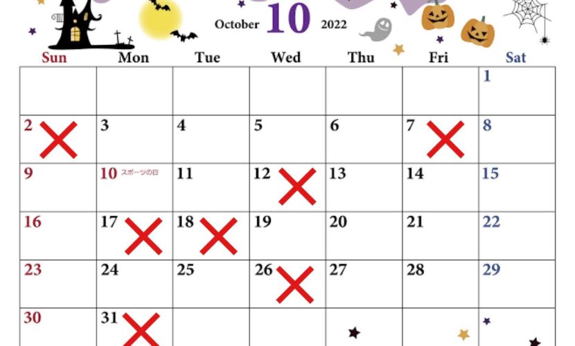 10月のお休みのお知らせです。毎月第一日曜日・最終月曜日は固定のお休みになります。